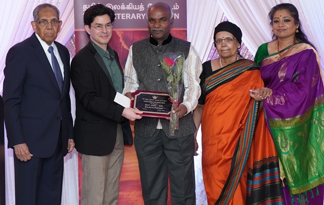 தமிழ் இலக்கியத்தில் வாழ்நாள் சாதனைக்காக இயல் விருது பெறும் எழுத்தாளர் பாவண்ணன், அவரது மனைவி அமுதாவுடன் வந்து விருதினைப் பெற்றுக் கொண்டார்.