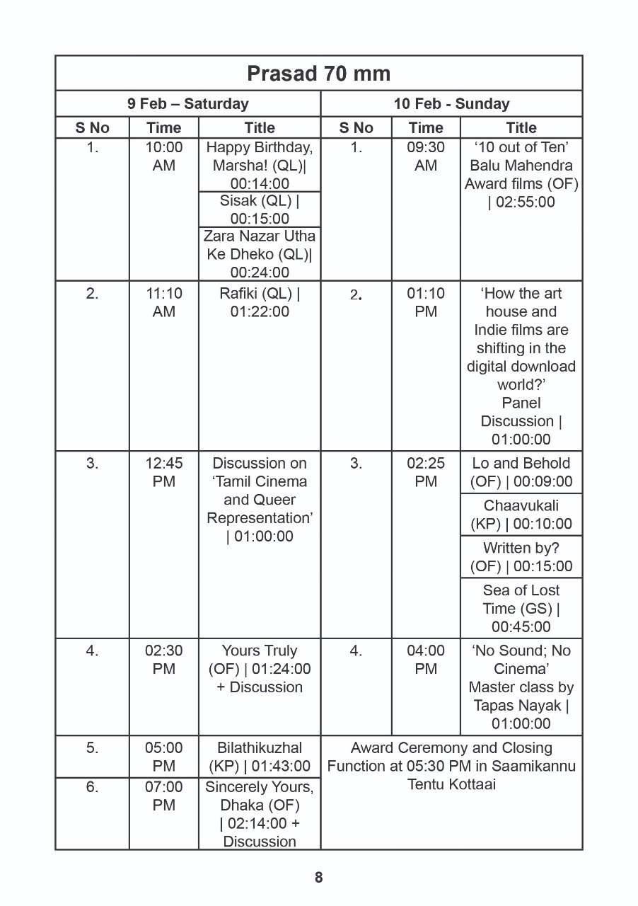 பிரசாத் லேப் தியேட்டர், பிரசாத் 70 எம்.எம். தியேட்டர், மற்றும் நுங்கம்பாக்கம் எம்.எம். தியேட்டர் ஆகிய மூன்று தியேட்டர்களில் இத்திரைப்பட விழா நடைபெறவுள்ளது.