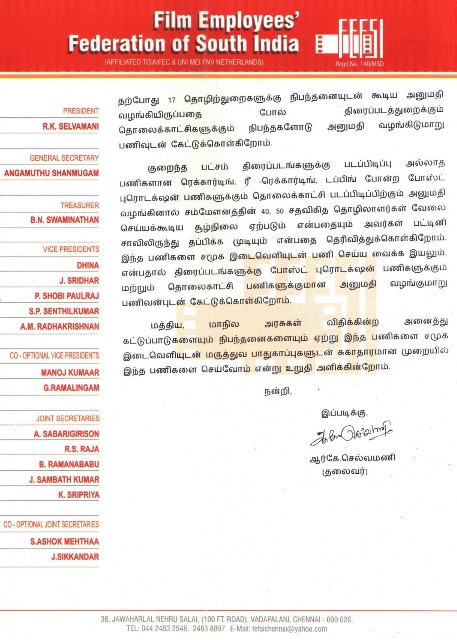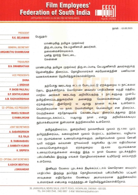 நாளை முதல் தொடரவுள்ள மூன்றாம் கட்ட ஊரடங்கு உத்தரவுகளில் சில தொழிற் துறைகளுக்கு விதிவிலக்கு அளிக்கப்பட்டிருப்பதுபோல் தமிழ்த் திரைப்படத் துறைக்கும், தமிழ்த் தொலைக்காட்சி துறைக்கும் விலக்களித்து திரைப்பட படப்பிடிப்புகள், போஸ்ட் புரொடெக்சன்ஸ் பணிகள், சின்னத்திரை தொடர் படப்பிடிப்புகள் ஆகியவற்றை நடத்திக் கொள்ள அனுமதி தருமாறு தென்னிந்திய திரைப்பட தொழிலாளர் சம்மேளனம் தமிழக முதலமைச்சரை கேட்டுக் கொண்டுள்ளது.