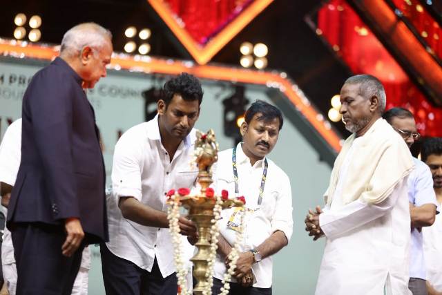 விழாவின் துவக்கத்தில் தமிழ்த் திரைப்பட தயாரிப்பாளர்கள் சங்கத்தின் தலைவர் விஷால் பேசும்போது, “எல்லா நாட்டிலும் ஆள்வதற்கு ஒரு ராஜா இருப்பார். ஆனால், பாடல் என்று வரும்போது ஆள்வதற்கு ஒரேயொரு ராஜாதான். அது நமது ‘இசைஞானி’ இளையராஜாதான்.