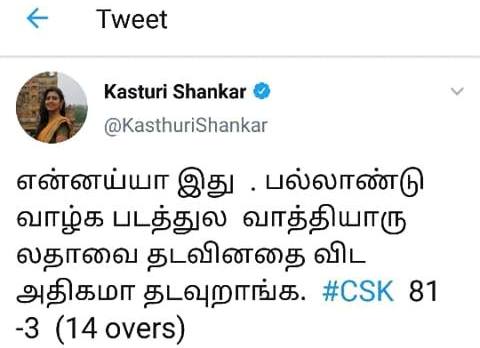 நேற்றைய போட்டியில் சி.எஸ்.கே. அணியினர் மந்தமாக விளையாடியைப் பார்த்து கடுப்பான கஸ்தூரி அந்த அர்த்த ராத்திரிலேயே வில்லங்கமான ஒரு டிவீட்டை போட்டு டிவிட்டர் உலகத்திலும் ரகளை செய்துவிட்டார்.