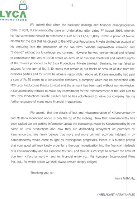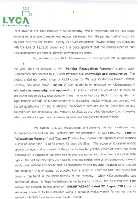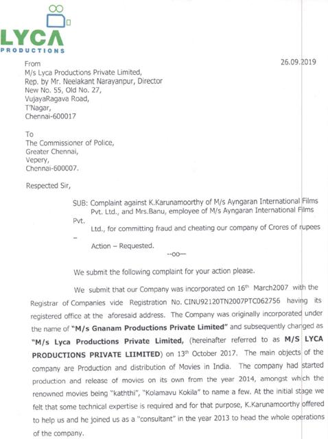 புகார் கொடுத்தக் கையோடு புகார் பிரதிகளையும் பத்திரிகையாளர்களுக்கு அனுப்பி வைத்திருக்கிறது லைகா நிறுவனம்.
