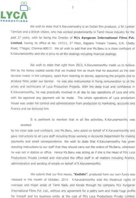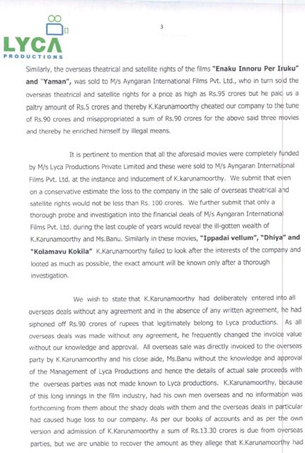 லைகா நிறுவனம் கருணாமூர்த்தி மீது சுமத்தியிருக்கும் குற்றச்சாட்டுக்களின் சுருக்கம் இங்கே :