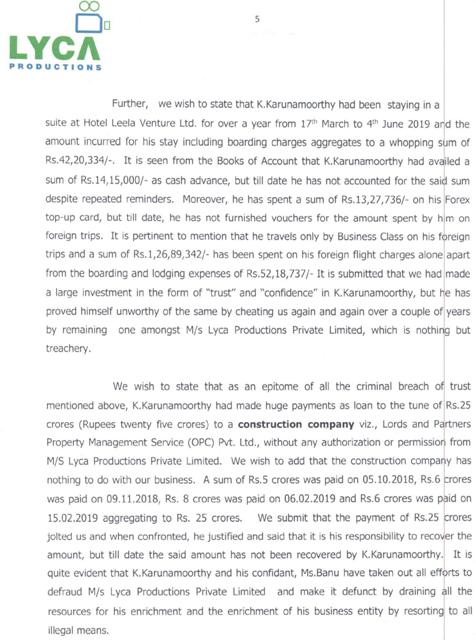 இது தவிர 2019 மார்ச் 17-ம் தேதி முதல் ஜூன் 4-ம் தேதிவரையிலும் லீலா வென்சூர்ஸ் ஓட்டலில் தங்கியதன் மூலம் 42,20,334 ரூபாயை லைகா நிறுவனத்துக்கு செலவு ஏற்படுத்தியுள்ளார். ரொக்கப் பணமாக அவ்வப்போது நிறுவனத்தில் இருந்து வாங்கிய 14,15,000 ரூபாய் மற்றும் ரூ.13,27,736 ஆகியவற்றிற்கு எந்த ரசீதும் அவர் இதுவரையிலும் அளிக்கவில்லை.