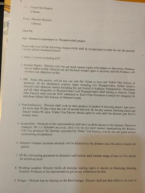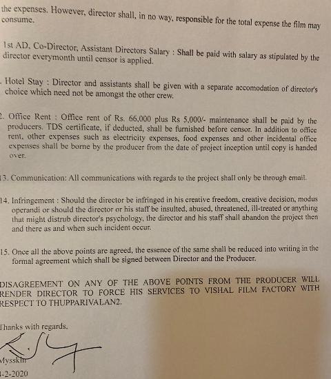 இந்த நிலைமையில் மிஷ்கின் ‘துப்பறிவாளன்-2’ படத்தை இயக்குவதற்கு விஷாலின் தயாரிப்பு நிறுவனமான ‘விஷால் பிலிம் பேக்டரி’ நிறுவனத்திற்கு எழுதிய 15 நிபந்தனைகள் அடங்கிய நோட்டீஸ் இன்று வெளியாகியுள்ளது.