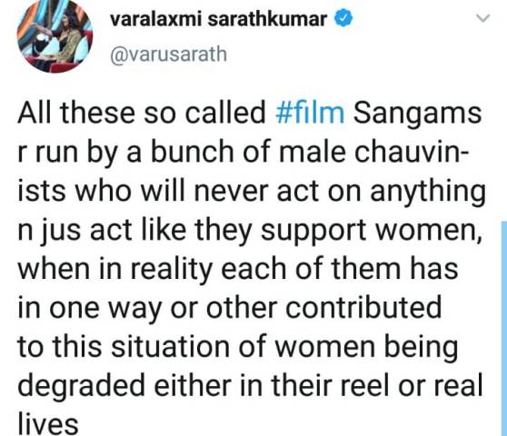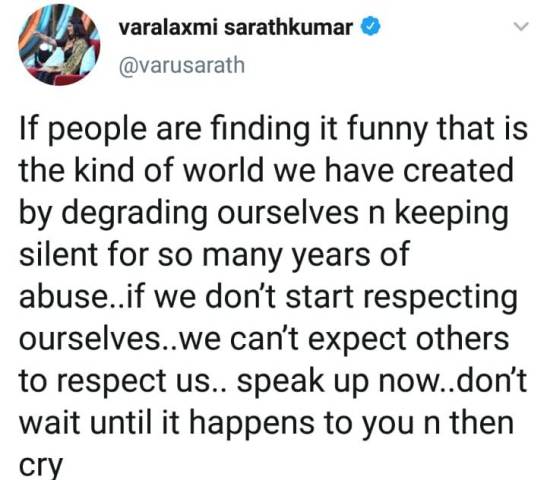 நடிகை வரலட்சுமி தனது டிவீட் செய்தியில், ”பெண்களை அசிங்கப்படுத்துவது, பெண்களைப் பற்றி ஆபாசமான நகைச்சுவை பேசுவது (பேசுபவர்களுக்கு ஆபாசம் என்று தெரியாது), பெண்களை இழிவுபடுத்துவது, பெண்களை காட்சிப் பொருளாகப் பயன்படுத்துவது எல்லாம் இந்த திரைத்துறையில் ஒரு பகுதியாக மாறிவிட்டது.
