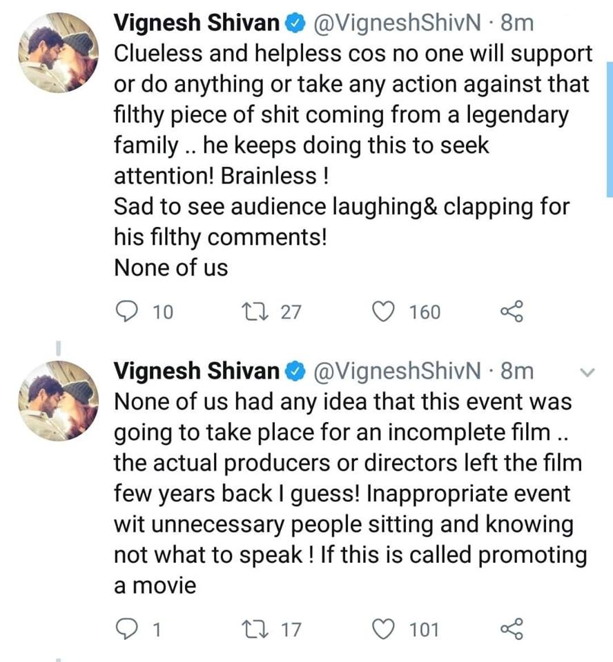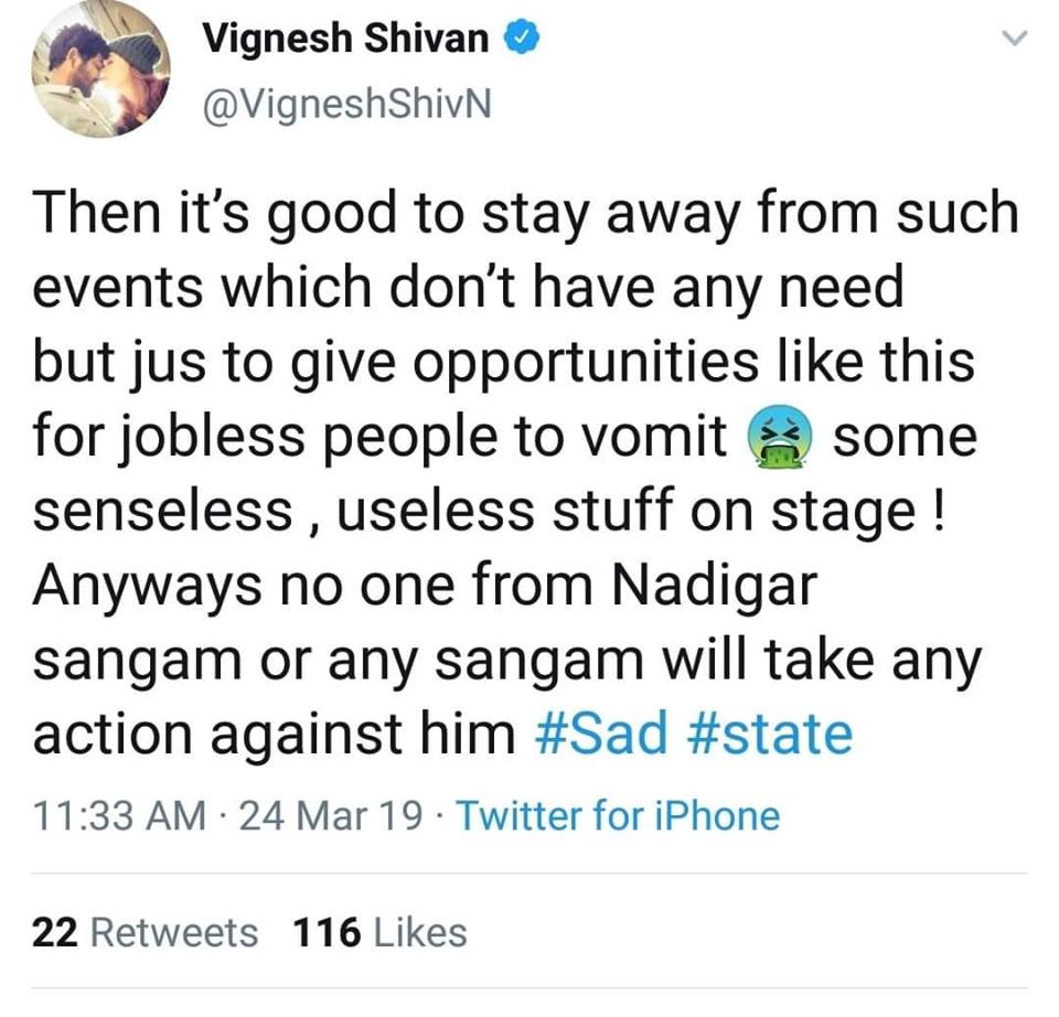 ஏனெனில் இத்தகைய நிகழ்ச்சிகள் வேலையற்ற நபர்களுக்கு தங்கள் அறிவற்ற கருத்துகளைச் சொல்ல இடமளிக்கிறது. என்ன நடந்தாலும் அவர் மீது நடிகர் சங்கத்தைச் சேர்ந்தவர்களோ, அல்லது வேறு எந்த சங்கத்தைச் சேர்ந்தவர்களோ நடவடிக்கை எடுக்கப் போவதில்லை. பரிதாப நிலைதான்…” என்று கொதித்துப் போய் எழுதியிருந்தார் விக்னேஷ் சிவன்.
