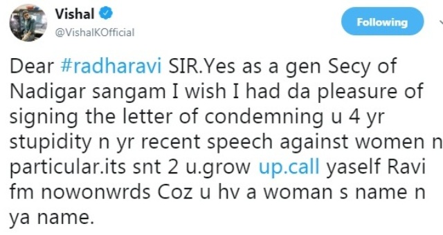 விஷால் வெளியிட்டுள்ள ட்வீட்டர் செய்தியில், ”அன்புள்ள ராதாரவி சார். ஆம், நடிகர் சங்கத்தின் பொதுச் செயலாளர் என்ற வகையில் உங்களுக்கு எதிரான இந்த கண்டனக் கடிதத்தில் கையெழுத்திடுவதில் நான் மகிழ்ச்சி கொள்கிறேன். அண்மையில் நீங்கள் வெளிப்படுத்திய முட்டாள்தனமான பேச்சு அதுவும் பெண்களை மையப்படுத்தி நீங்கள் பேசியதை கண்டிக்கிறேன். வளருங்கள் சார். இனிமேல் உங்களை நீங்கள் ‘ரவி’ என்று மட்டுமே அழைத்துக் கொள்ளுங்கள். ஏனெனில் ‘ராதா’ என்பது ஒரு பெண்ணின் பெயரல்லவா..?” என்று இடித்துரைத்துள்ளார்.