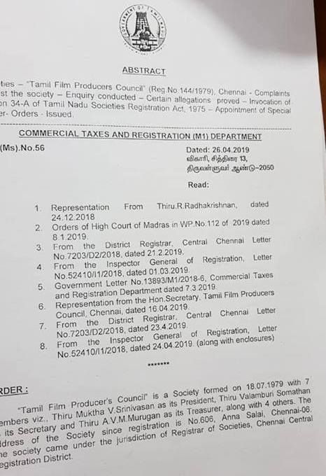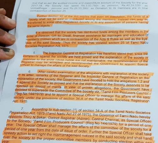 இதன்படி தமிழ்த் திரைப்பட தயாரிப்பாளர் சங்கத்தின் தற்போதைய நிர்வாகக் குழு கலைக்கப்படுவதாகவும், மறு தேர்தல் நடத்தப்படும்வரையிலும் சங்கத்தை நிர்வகிக்க மத்திய சென்னை பகுதியின் நிர்வாகப் பதிவாளரான என்.சேகர் தமிழ்த் திரைப்பட தயாரிப்பாளர் சங்கத்தின் பொறுப்பாளராகச் செயல்படுவார் என்றும் அந்த உத்தரவில் தெரிவிக்கப்பட்டிருந்தது.