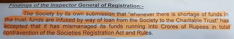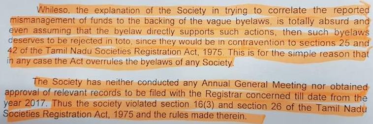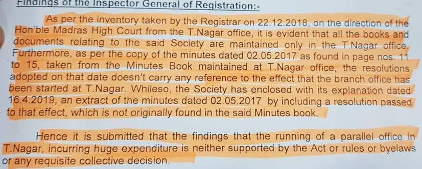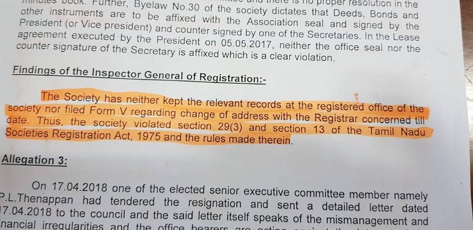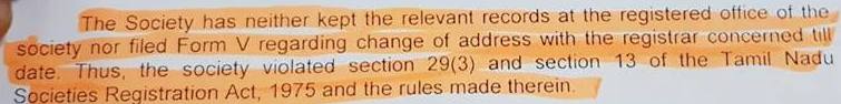 புகார்தாரர் கூறியதுபோல இது ஒருமித்த முடிவு கிடையாது. தேவையான ஆவணங்களை பதிவு அலுவலகத்தில் வைத்துக் கொள்ளவில்லை. முகவரி மாற்றத்துக்கான விண்ணப்பத்தை இதுவரை பதிவாளரிடம் அளிக்காமல் தமிழ்நாடு சங்கங்கள் பதிவுச் சட்டத்தின் 29(3), 13 ஆகிய பிரிவுகளை மீறியுள்ளர்கள்.