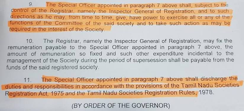 இல்லாவிட்டால், உங்களது சங்கத்தை நிர்வகிக்க அரசுத் தரப்பில் இருந்து சிறப்பு அதிகாரி ஒருவர் நியமிக்கப்பட்டு சங்கத்தின் மேலாண்மை அதிகாரம் தமிழக அரசால் எடுத்துக் கொள்ளப்படும்.