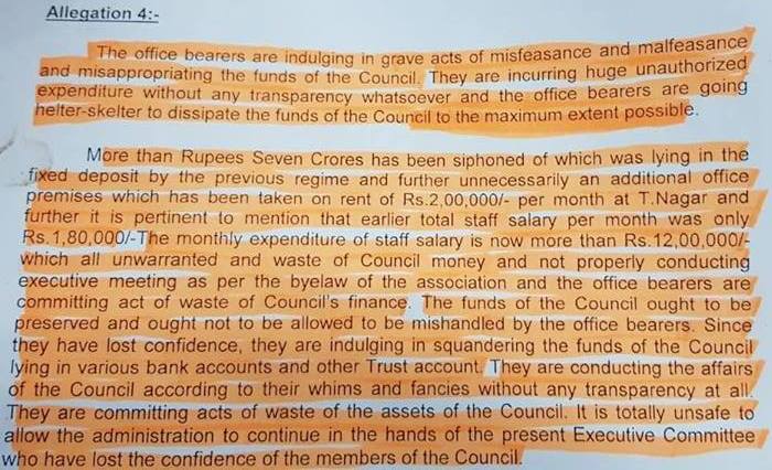 சங்கத்தின் குறிப்பு கோப்புகளை செயற்குழுவின் ஒப்புதலை பெறவில்லை. தியாகராயநகரில் தனி அலுவலகம் எடுக்கப்பட்டு, அதற்கு முன் பணம் என்ற பெயரில் 16 லட்சம் ரூபாய் அளிக்கப்பட்டுள்ளது. 2017-ம் ஆண்டில் இருந்து வாடகையாக மாதம் 2 லட்சம் ரூபாய் அளிக்கப்பட்டுள்ளது.
