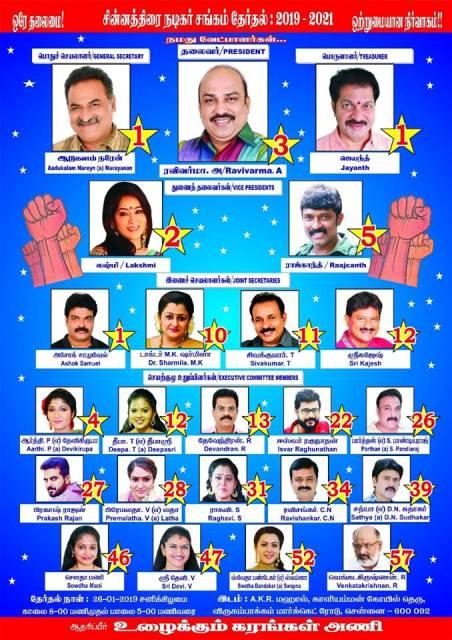 நடிகைகள் ஷில்பா, கரோலின், சன்தோஷி, ஸ்வேதா, சுஜாதா மற்றும் நடிகர்கள் சதீஷ், வசந்த்குமார், அஸ்வின் குமார், பிர்லா, ஜெயராமன், எஸ்.பி.செந்தில் வேல், கோபாலகிருஷ்ணன், கே.பி.அண்ணாதுரை ஆகிய 14 பேர் செயற்குழு உறுப்பினர் பதவிக்கு போட்டியிடுகின்றனர்.