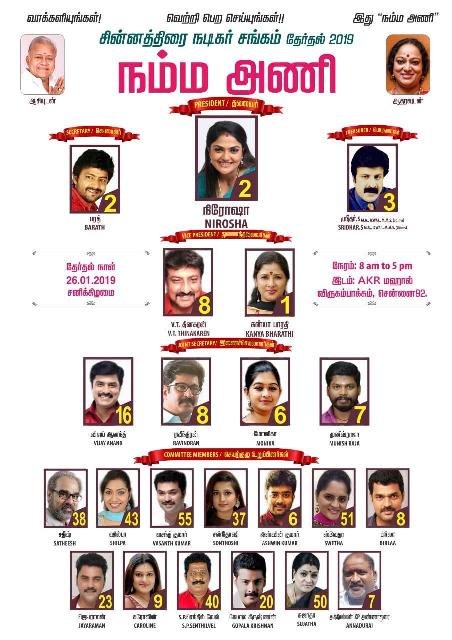 நடிகை நிரோஷாவின் தலைமையிலான ‘நம்ம அணி’யில் அவரே தலைவர் பதவிக்குப் போட்டியிடுகிறார். நடிகர் பரத் செயலாளர் பதவிக்கும், நடிகர் ஸ்ரீதர் பொருளாளர் பதவிக்கும் போட்டியிடுகின்றனர்.